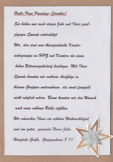 Mit großer Freude haben wir die selbst gebastelte Weihnachtskarte mit Fotos der Kinder aus dem Gruppenhaus 8 erhalten.